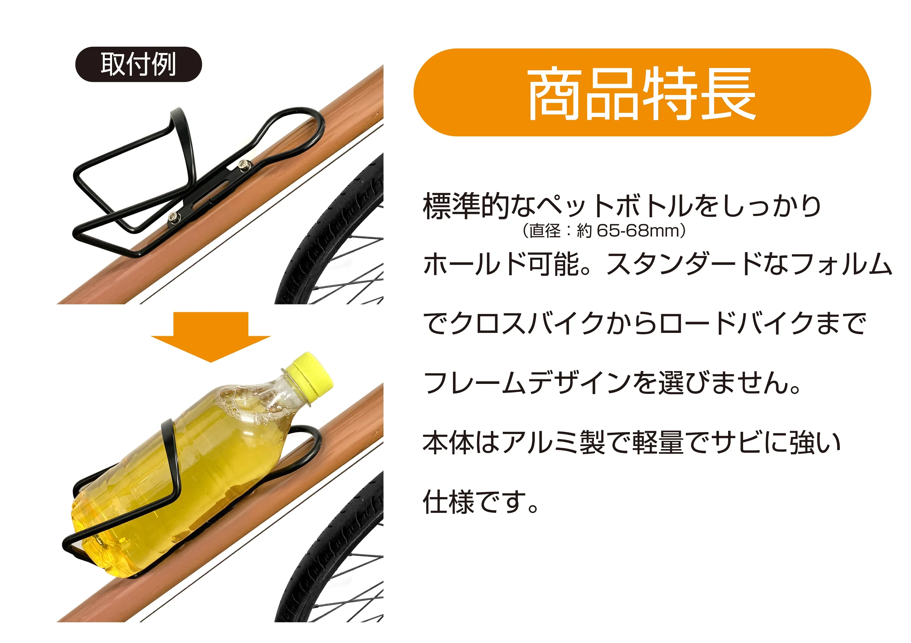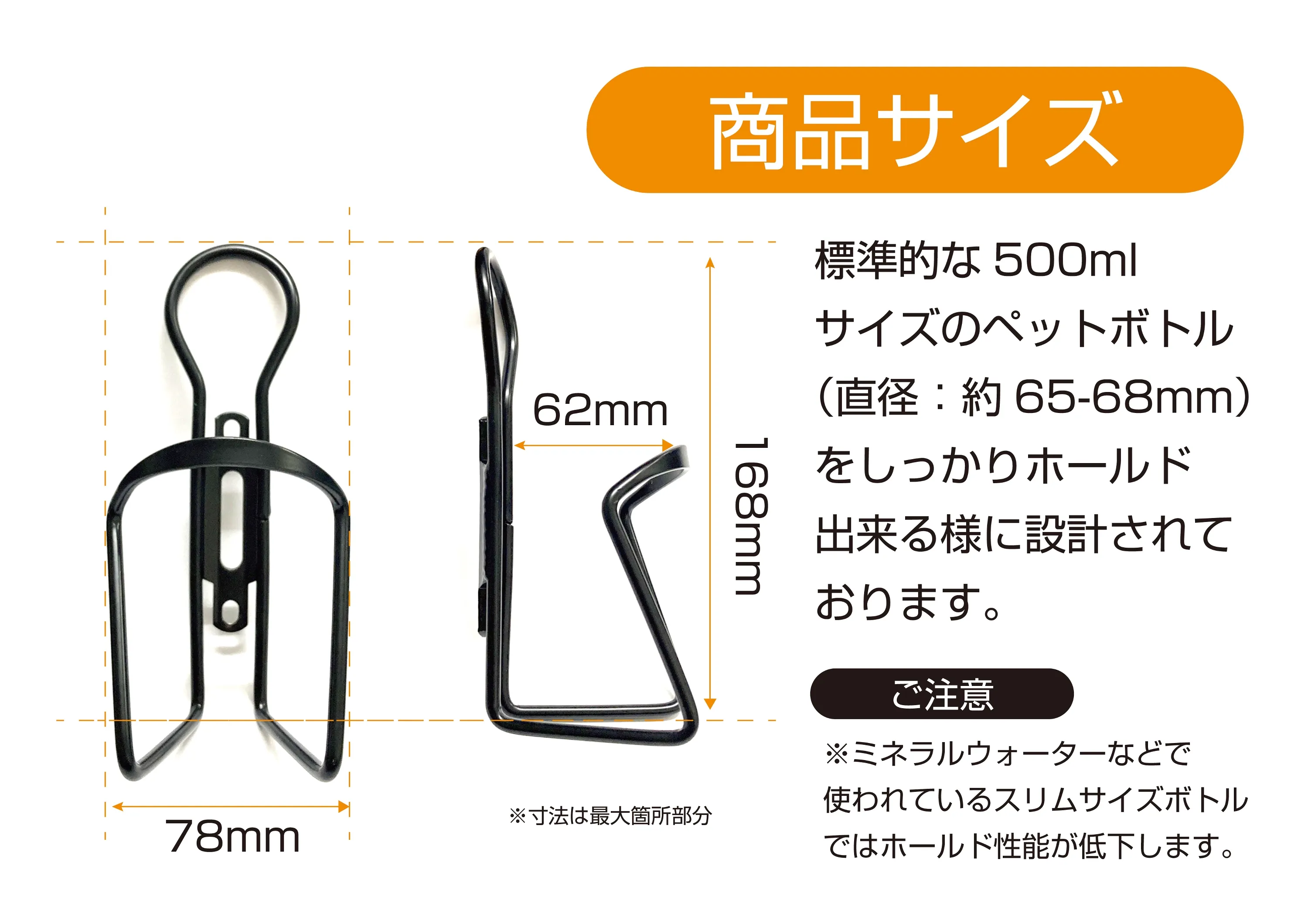 標準的なペットボトル(直径65~68㎜)をしっかりホールド可能なボトルケージです。