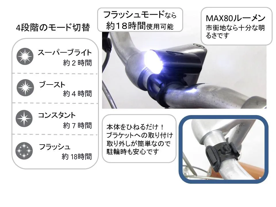 最大80ルーメンで、前方をしっかり照らし、周囲の自動車や歩行者に自転車の存在を知らせます。